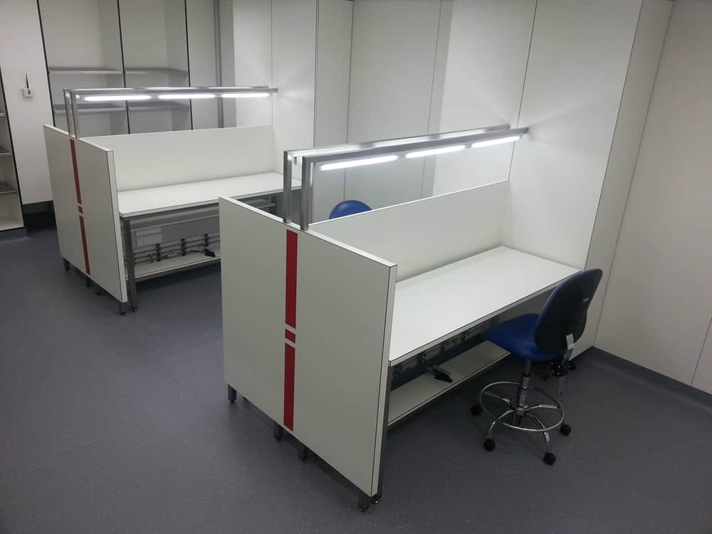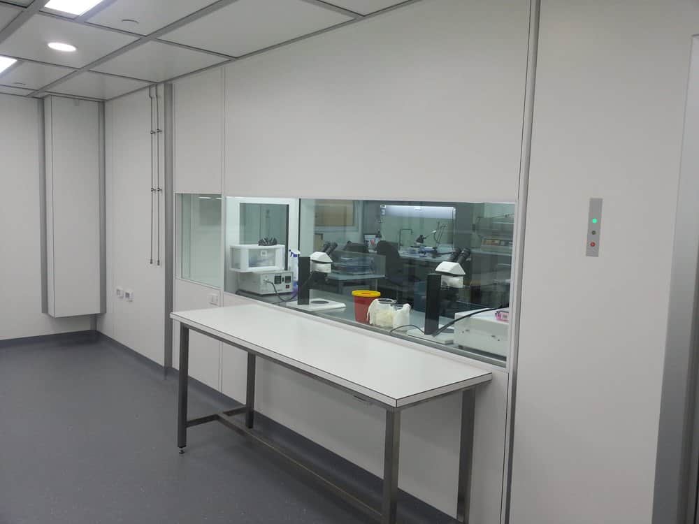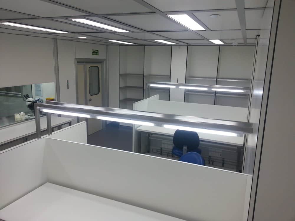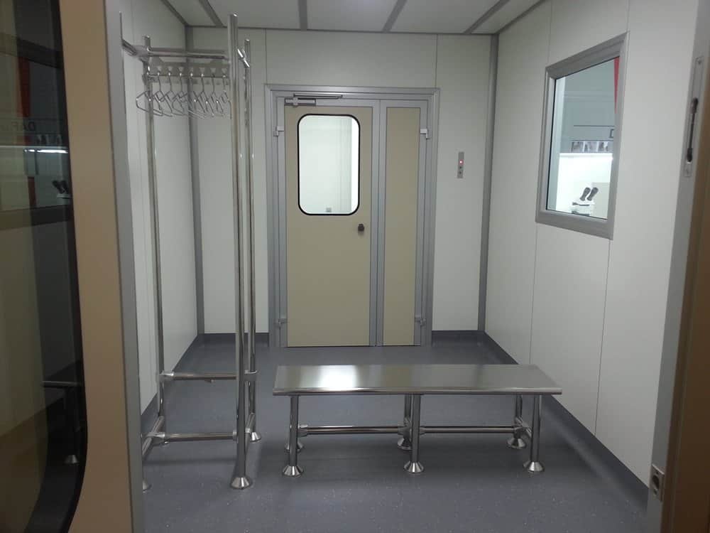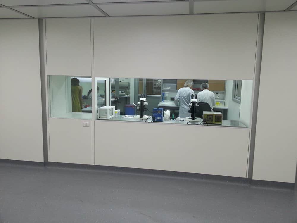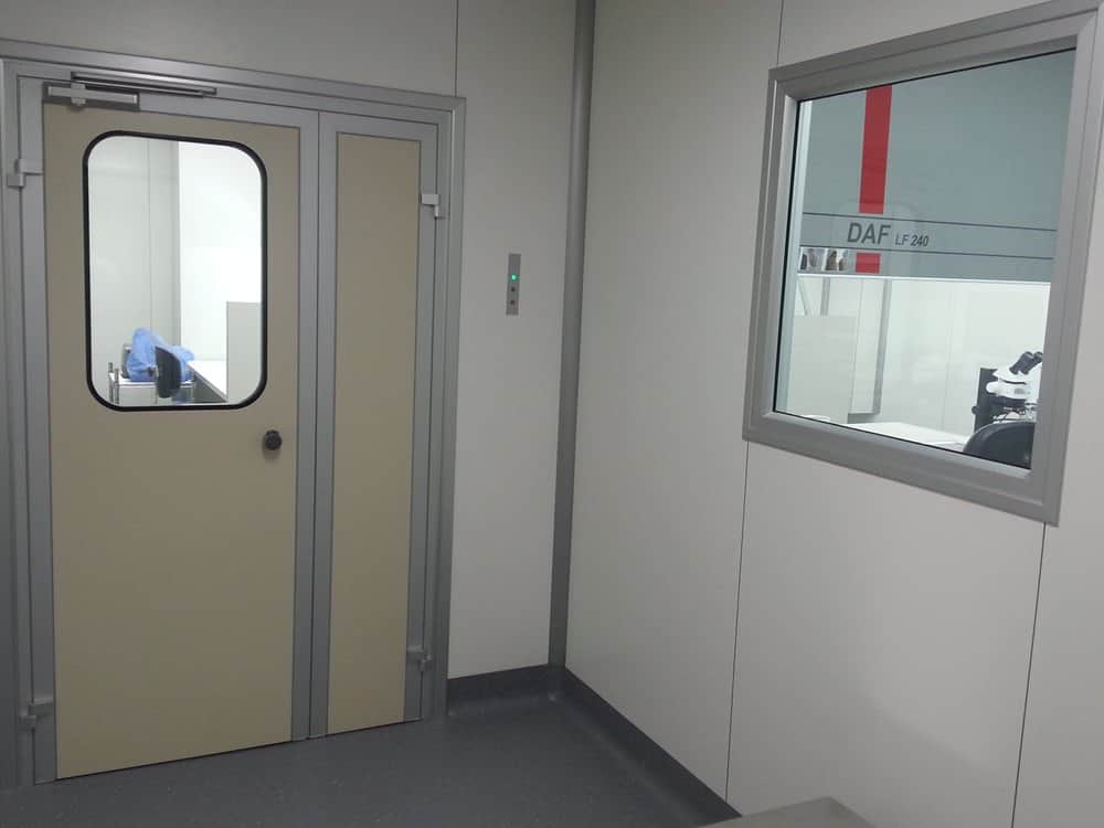 The clean room, preparations lab, laminar flow chamber and transition chamber were constructed as a single integral unit with a transition room and employees’ changing rooms constructed on the other side of the room.